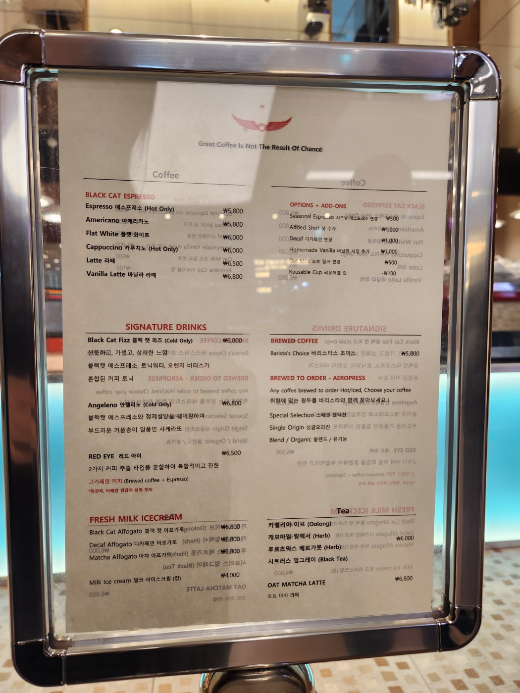 *시그니처 메뉴인 '블랙 캣 피즈(커피 토닉)'와 '안젤리노(샤케라또)'가 유명해요!